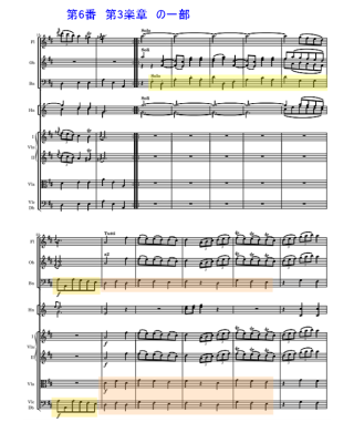 もう少し具体的に記載をしてみる。第3楽章のMenuet の最初の部分。出だしの部分は全てのパートがユニゾンではないが、各1名の低弦の旋律はユニゾンになっている。一方Trioの後半部分。ここではスコアでは、低弦のva.vc.,fg.はsoloになっている。前半のMenuet